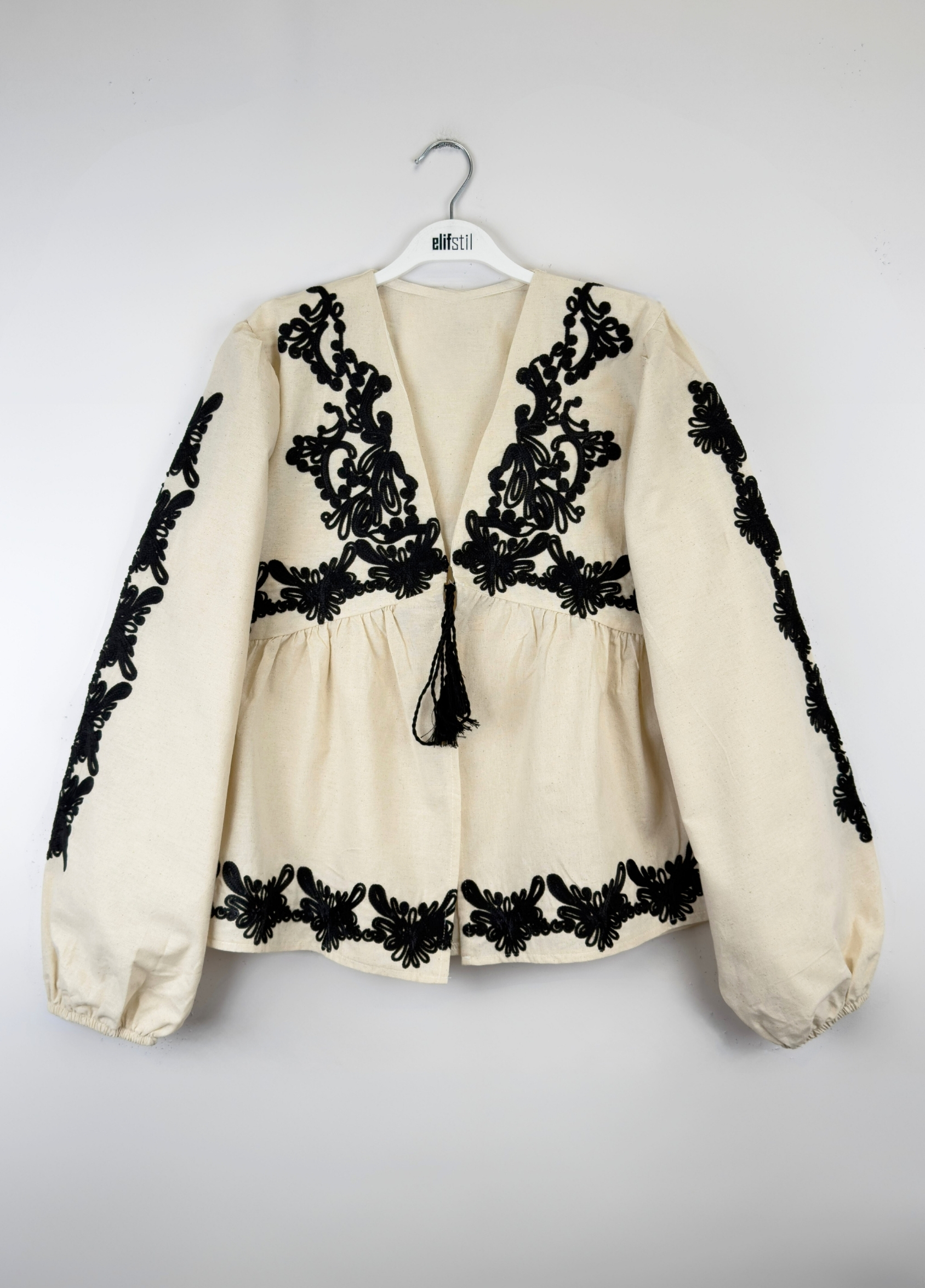 Şık işlemeleriyle öne çıkan bu siyah bluz, zarif detayları ve modern kesimiyle her kombinle uyum sağlayan zamansız bir parça. Geniş kol formu ve rahat yapısıyla hem konforlu hem de göz alıcı bir görünüm sunar.